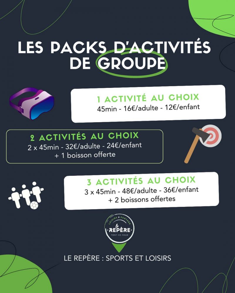 Chez Le Repère Pont de Vaux, nous nous engageons à vous offrir des expériences uniques et inoubliables. C'est pourquoi nous avons soigneusement sélectionné un ensemble d'activités passionnantes pour créer des packs adaptés à tous les goûts et à tous les groupes. Nos packs incluent 2 ou 3 activités palpitantes, avec boissons comprises pour que vous puissiez profiter pleinement de votre moment.